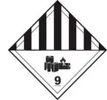 對瓦特小時的額定值不超過100Wh的移動電源(鋰離子電池組),如符合聯合國《關于危險貨物運輸的建議書 規章范本》(第20修訂版)第3.3章188特殊條款等相關規定可免除標簽的要求。對瓦特小時的額定值大于100Wh的移動電源(鋰離子電池組),其運輸包裝上應加貼下圖中9A號危險性運輸警示標簽。