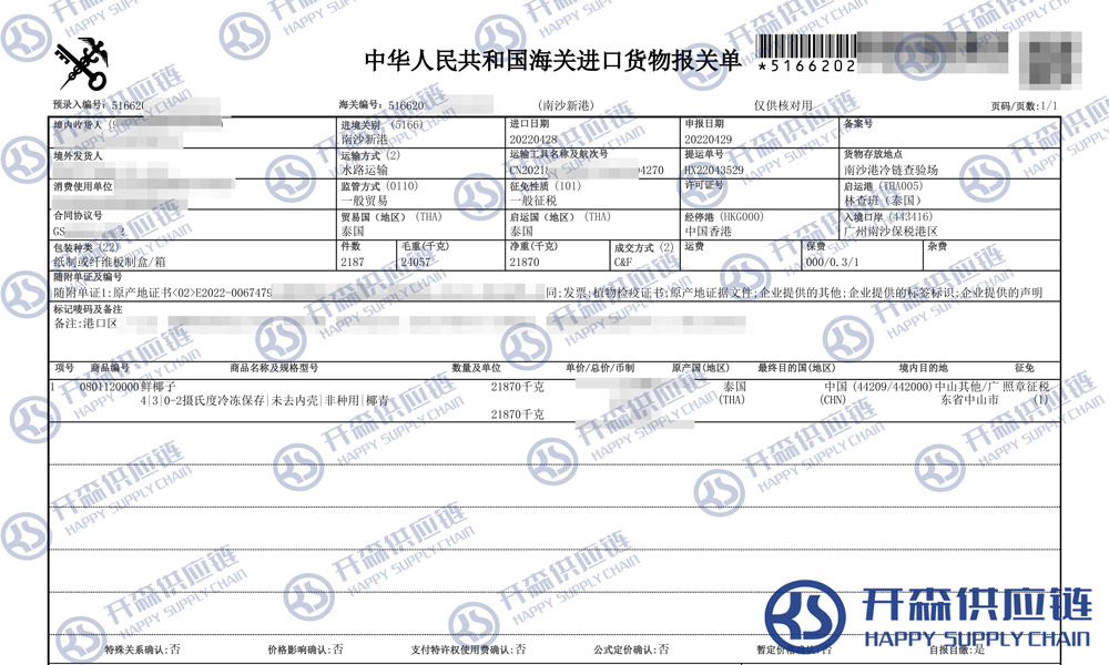 【本文結語】 上述就是泰國鮮椰子進口清關報關代理服務【經典案例】的全部內容,希望能對您有所幫助,如有水果進口報關上任何疑問及問題可隨時在線聯系我們或撥打 18002611553,開森供應鏈擁有豐富的水果進口報關操作經驗及案例,10余年進口經驗為您所用,各類進口疑難都能為您一一解答及協助快速處理解決!